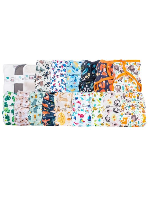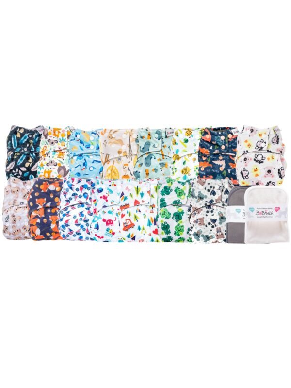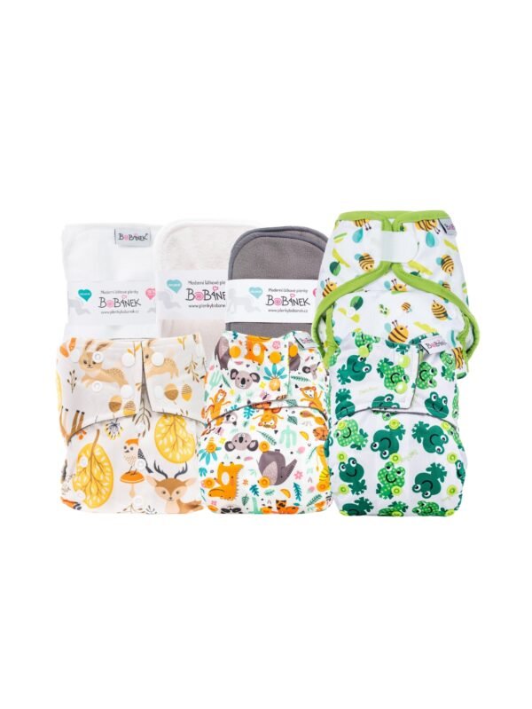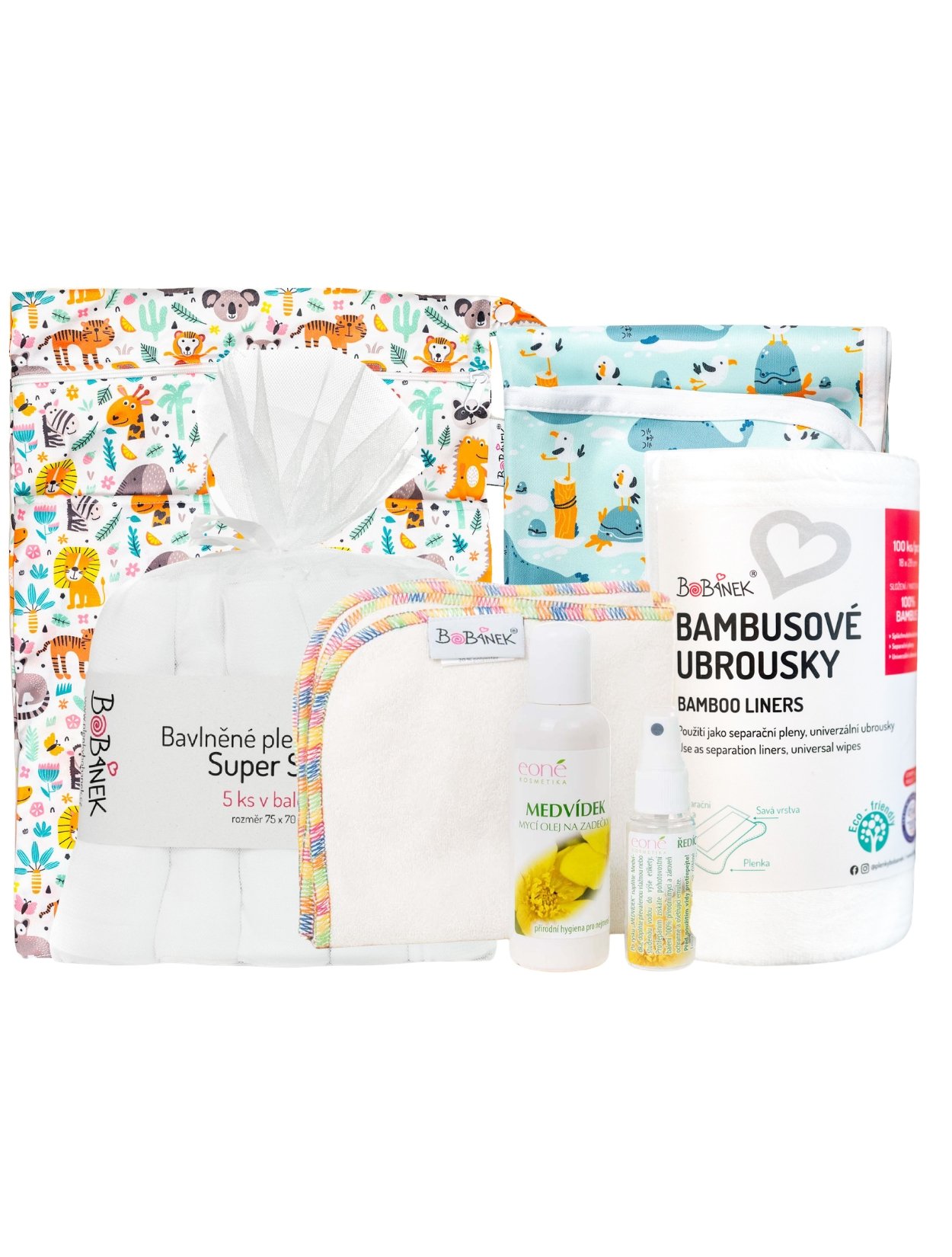 Súčasťou sady je nepremokavá taška, ktorá spoľahlivo ochráni obsah pred vlhkosťou a nečistotami. Taška má dve vrecká. Vhodná na použité plienky, oblečenie alebo prebaľovacie pomôcky – ideálna do pôrodnice, kočíka aj auta. Rozmer: 30 x 36 cm.
